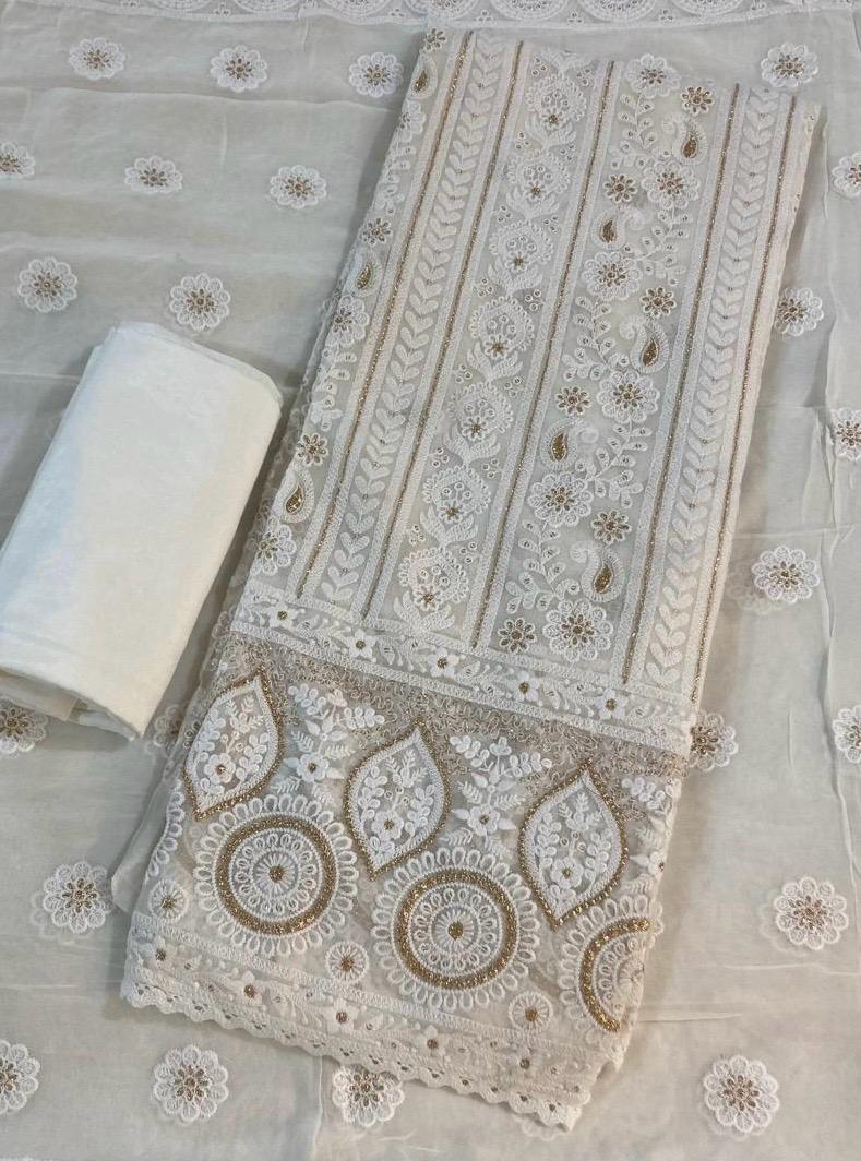 White Threadwork Georgette Unstitched Salwar Suit Set